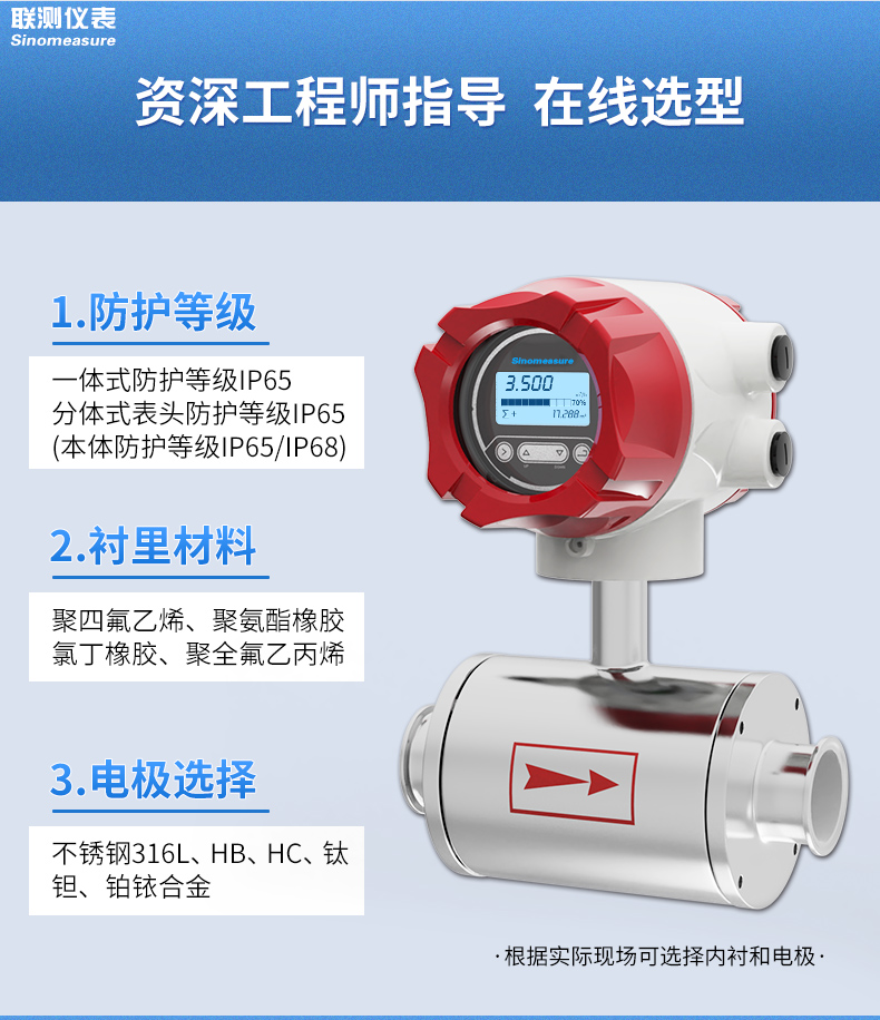 產品描述:聯測LDG-SINW衛生型電磁流量計廣泛應用于食品,醫藥等衛生型行業及溫泉、飲料等領域的流量計量。多用于現場工況或者介質要求衛生類型。