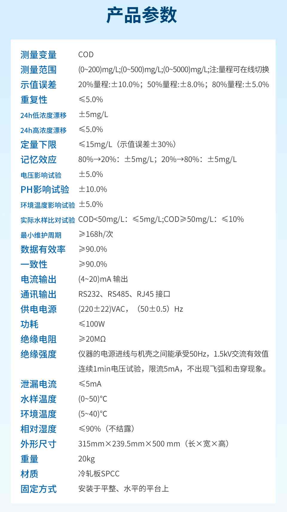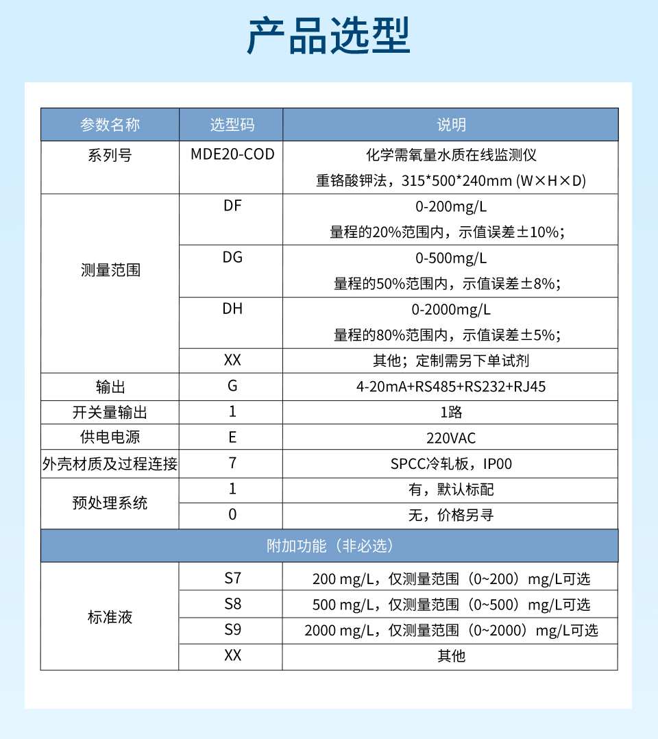 產品描述:COD水質在線分析儀采用重鉻酸鹽法檢測,符合《化學需氧量(CODCr)水質在線自動監測儀技術要求及檢測方法》(HJ 377)、《水質 化學需氧量的測定 重鉻酸鹽法》(HJ 828)和《水質化學需氧量的測定 快速消解分光光度法》(HJ/T 399)、《污染物在線自動監控(監測)系統數據傳輸標準》(HJ 212)、《地表水自動監測儀器通信協議技術規定》等標準和規范的要求。