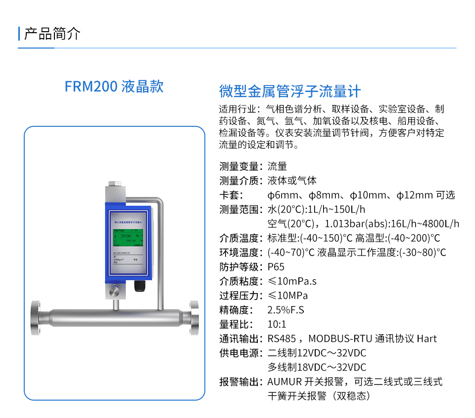產品描述:微型金屬管浮子流量計是測量微小流量的金屬管浮子流量計,可以測量微小流量的氣體和液體。全金屬結構設計,適用于高溫高壓和腐蝕性介質條件。該流量計可廣泛應用于氣相色譜分析、取樣設備、實驗室設備、制藥設備、氮氣、氬氣、加氧設備以及核電、船用設備、檢漏設備等。儀表安裝流量調節針閥,方便客戶對特定流量的設定和調節。