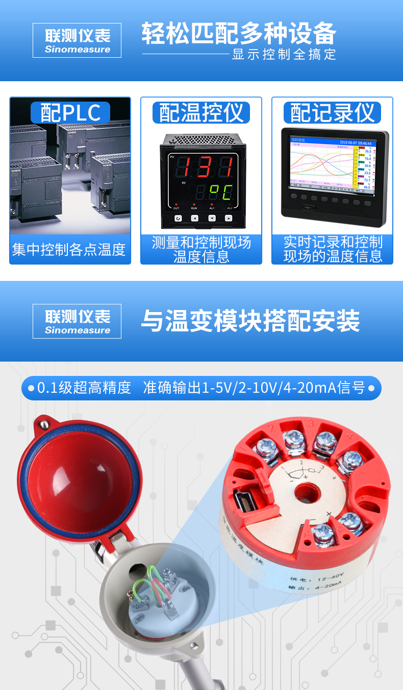 產(chǎn)品描述:聯(lián)測(cè)溫度傳感器可以直接測(cè)量各種生產(chǎn)過(guò)程中液體,蒸汽和氣體介質(zhì)以及固體表面的溫度,通常和顯示儀表、記錄儀表等配套使用。