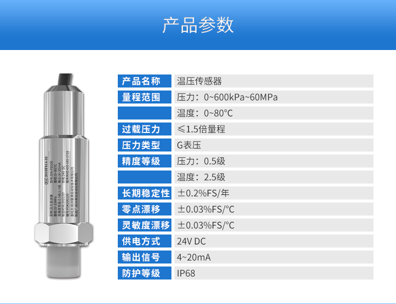 產品描述:溫壓一體變送器是集壓力、溫度一體測量的變送器。 選用高可靠硅壓阻壓力傳感器、熱電阻等作為核心元件, 經過溫度補償、數字電路修正和信號調理,輸出標準的 工業信號。產品都經過精心設計、元器件篩選、工藝驗 證固化、循環加載老煉、環境模擬測試等過程,保障每 只產品穩定可靠。 溫壓一體變送器以其優良的準確度和可靠性,廣泛 應用于各類壓力測量。尤其在煤礦、油田、化工、環保、 醫藥、水務等行業。
