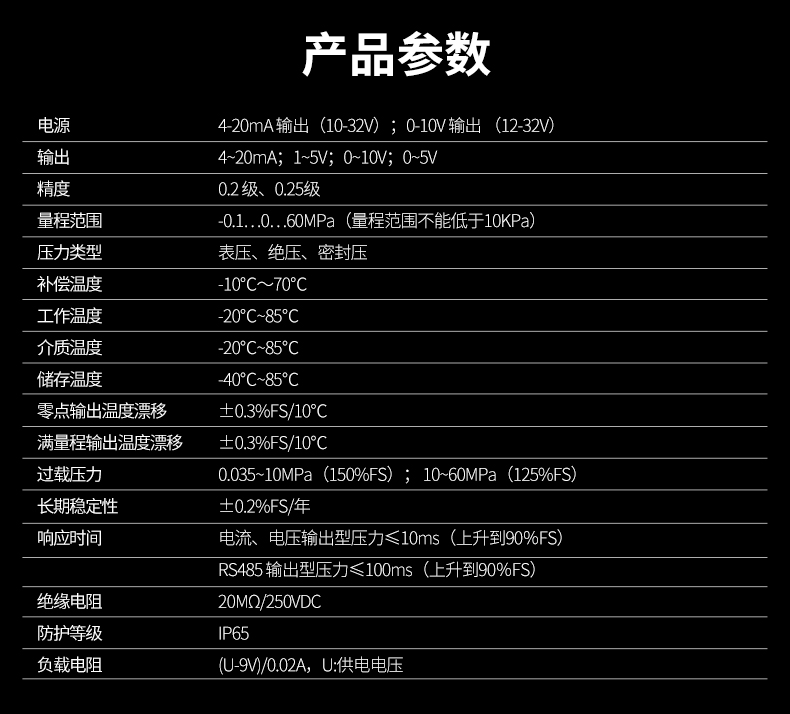 產品描述:擴散硅壓力變送器選用進口高精度、高穩定性壓力 敏感芯片。敏感芯片采用先進的微機械刻蝕加工工藝, 通過在硅片上擴散四個高精度電阻,從而形成惠斯通電 橋。由于壓阻效應,四個橋臂電阻的阻值發生變化,電 橋失衡,敏感元件輸出一個對應壓力變化的電信號。輸 出的電信號通過 24 位 AD 數字芯片的放大和非線性矯正 的補償,產生與輸入壓力成線性對應關系的電壓、電流 信號。CN6