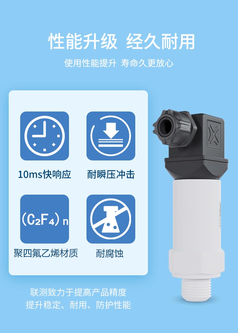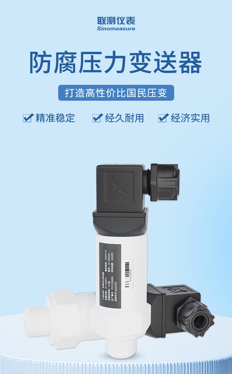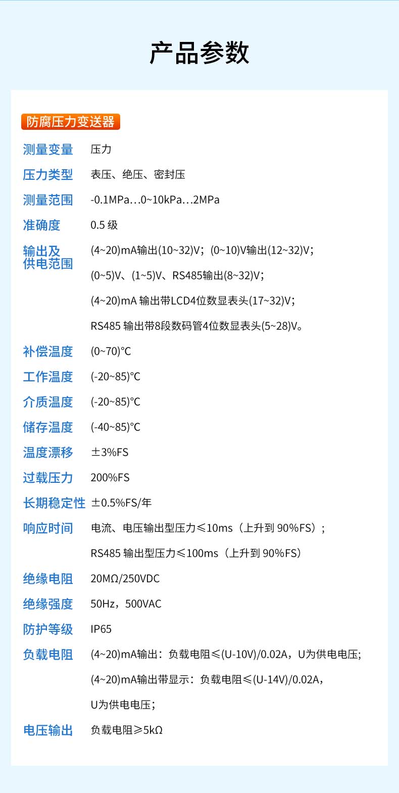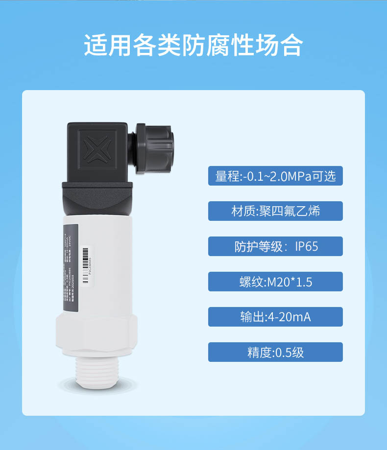 產品描述:防腐壓力變送器選用陶瓷壓阻壓力傳感器,經過高可靠性的放大電路及精密溫度補償,將被測介質的壓力轉換成標準電信號,高質量的傳感器及完善的裝配工藝確保了該產品的優異質量和性能。該產品采用了聚四氟乙烯材質,具有良好的抗腐蝕性,主要應用于化工領域,尤其適用于酸、堿等腐蝕性介質的壓力測量