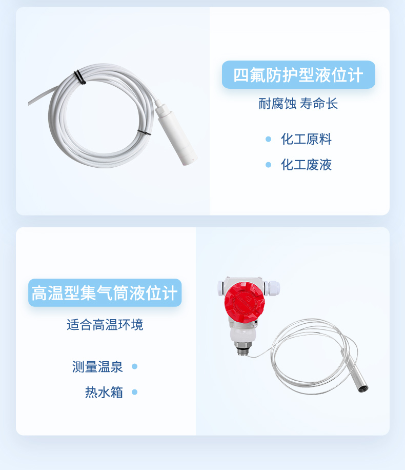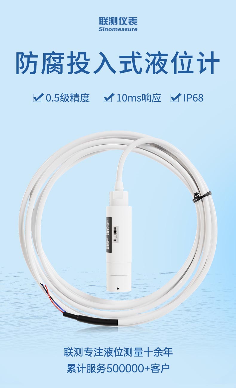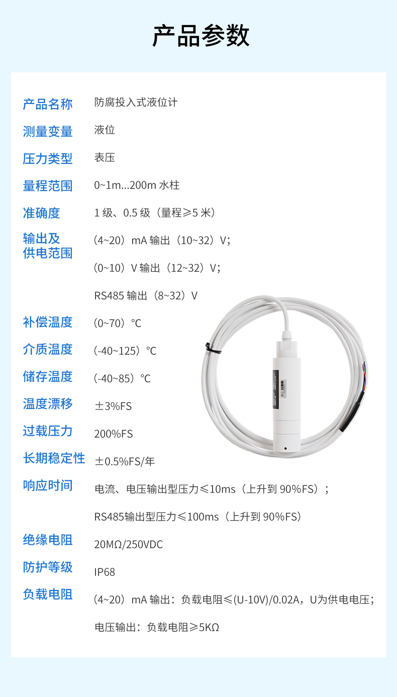 產(chǎn)品描述:防腐投入式液位變送器由高性能陶瓷壓力傳感器作為測量元件,把與液位深度成正比的液體靜壓力準(zhǔn)確的測量出來,并經(jīng)過信號(hào)調(diào)理電路轉(zhuǎn)換成標(biāo)準(zhǔn)的電流、電壓或 RS485 信號(hào)輸出,建立起輸出信號(hào)與液位深度的線性對應(yīng)關(guān)系,實(shí)現(xiàn)對液體深度的測量。產(chǎn)品采用聚四氟乙烯防腐材質(zhì),具有優(yōu)良的耐腐蝕性能,廣泛適用于化工廠酸、堿性等腐蝕介質(zhì)的液位測量。