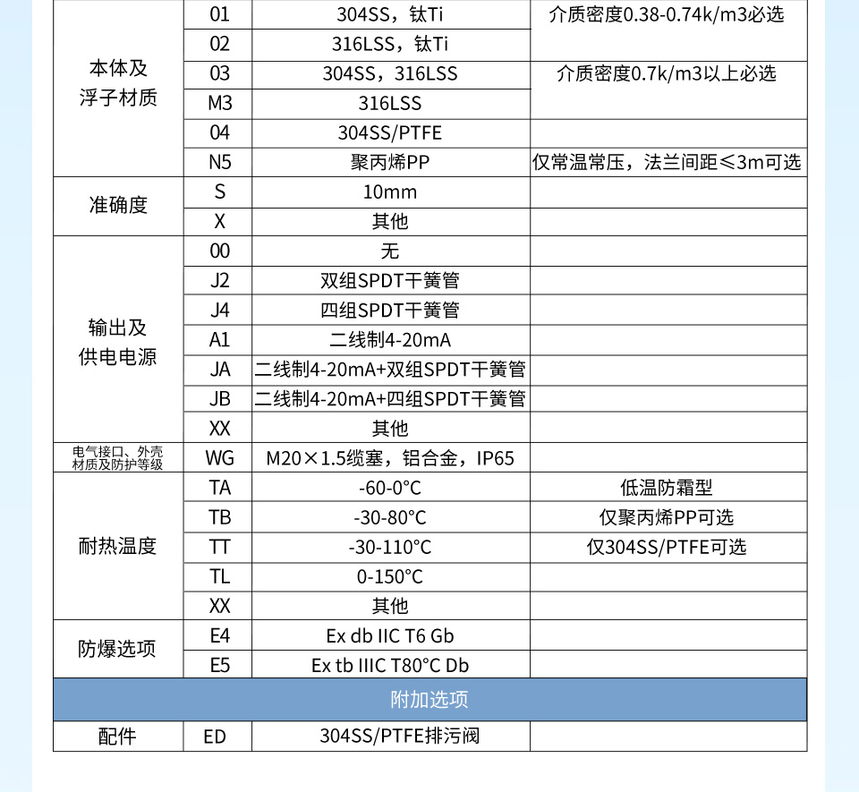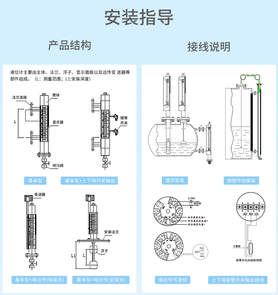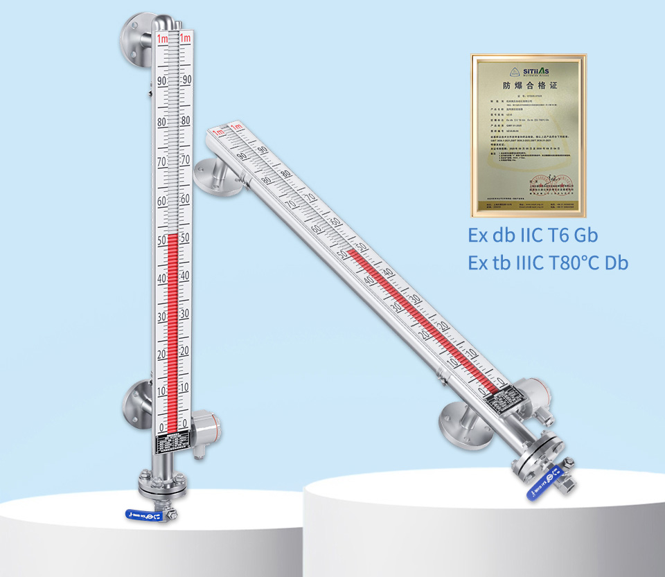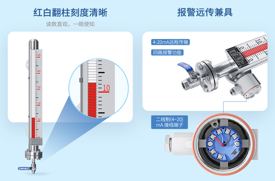 產品描述:磁翻板液位計用于測量有壓容器或開口容器內液體的液位。本產品不僅可就地指示,配上液位控制開關、報警開關,可實現(xiàn)液位的控制、報警和連鎖,配上內置式一體化液位變送器,可將液位(界面)信號轉換成二線制(4~20)mA 標準信號,實現(xiàn)液位遠距離檢測和控制。可廣泛應用于石油加工、市政、食品加工、化工、水處理、制藥、電力、造紙、冶金、船舶和鍋爐等領域。